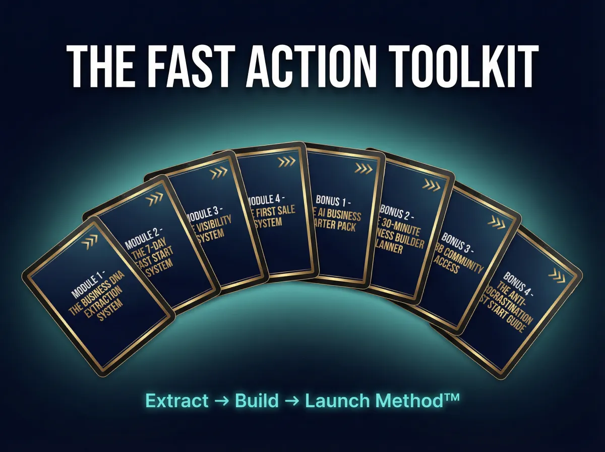 A: Most programmes hand you strategies without first helping you figure out what YOUR business should be. The Fast Action Toolkit starts with extraction — identifying the specific knowledge and skills you already have — then builds everything around that. You are not copying someone else's model. You are building something that is genuinely yours.