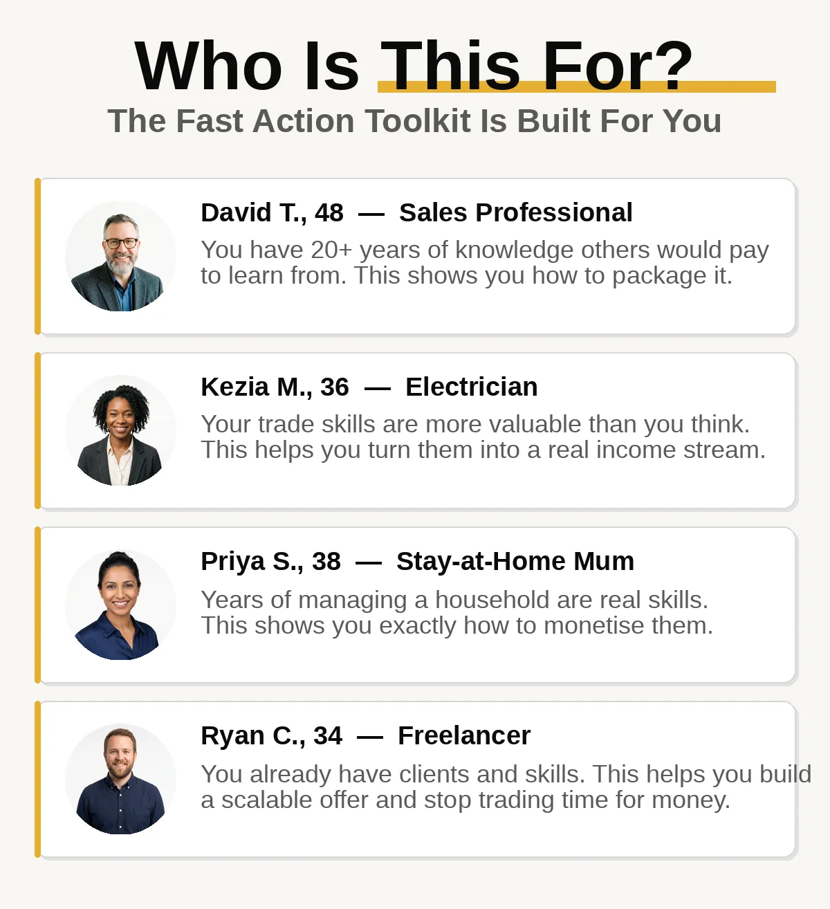 A:The Fast Action Toolkit is for anyone who has skills, knowledge, or experience and wants to turn it into an online income — but does not know where to start. Whether you are employed, self-employed, a tradesperson, a stay-at-home parent, or simply someone who has tried before and stopped, this system was built for you. If you have ever thought "I know a lot about this but I have no idea how to make money from it" — this is for you.